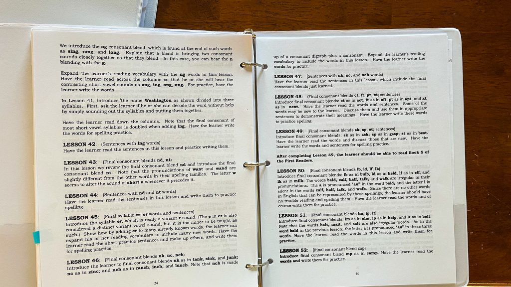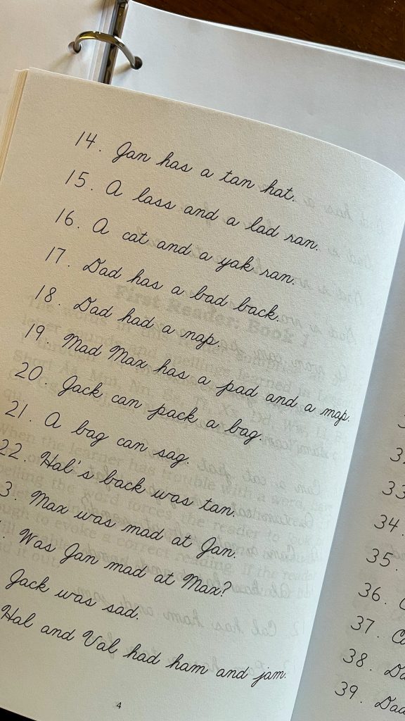 All of the readers can be found here and printed freely. I have them all printed with their covers and arranged sequentially in a single binder with tabbed dividers between each reader, so that my 4 and 5 year old readers can easily find which book they’re reading from as we move through reading practice. This is the 2nd binder I use for this curriculum, with the main Alpha Phonics Primer lessons and the full instruction manual printed and arranged in my 1st binder.