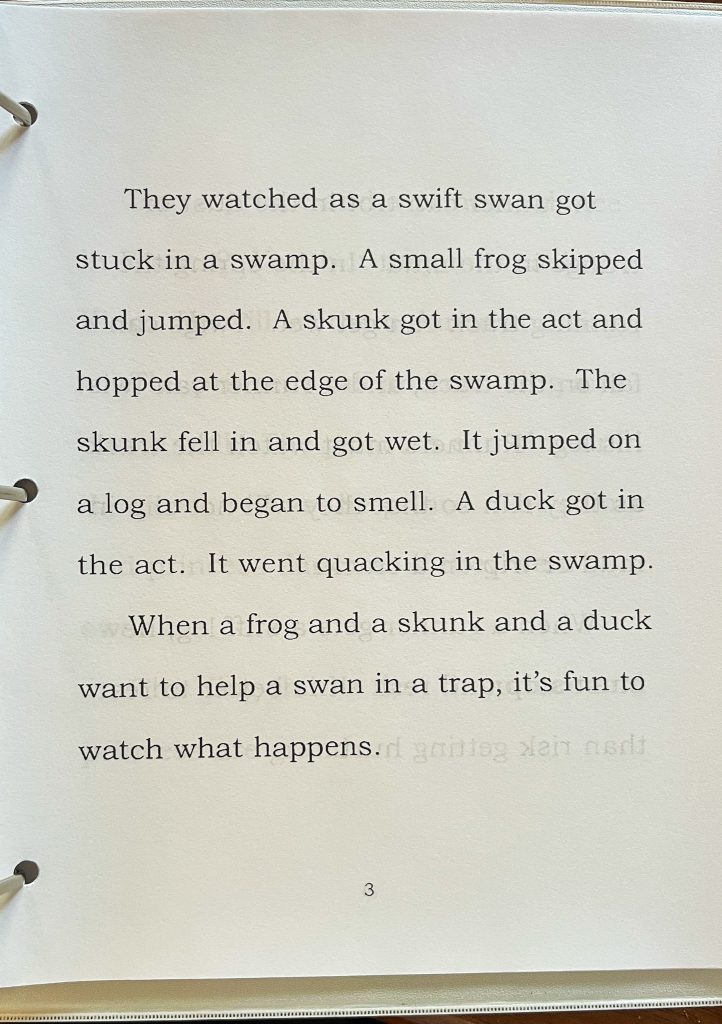 Students begin by learning the names and sounds of individual letters, and of course identifying upper and lowercase letters. They then start by blending two sounds together at a time and recognizing the words that the sounds make, “as, at, ax, am” etc. The first fourteen chapters really cement this understanding of blending by using only the short-a, no long vowel sounds, and no other vowels, until the concept is truly in their mental framework for reading. I love that!